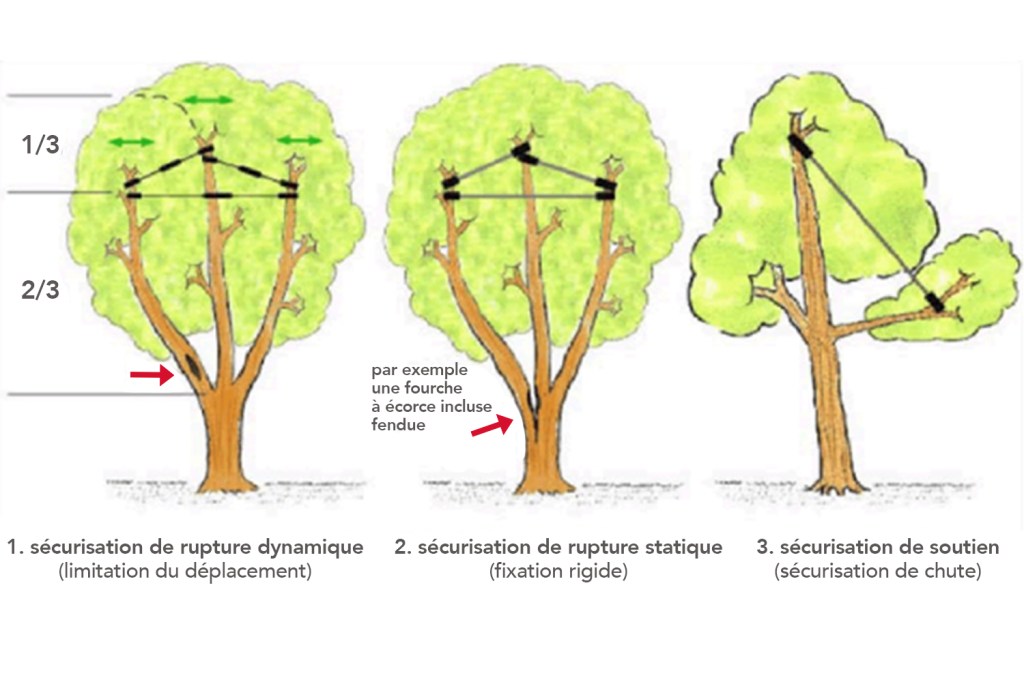 Cette technique a pour but de maintenir un arbre qui présente des défaillances mécaniques sans pour autant le réduire. La pause de haubans consiste à consolider l’arbre en faisant divers points d’attaches avec du matériel prévu à cet effet. Cela apporte une sécurité au sol car le hauban empêche la chute des branches en cas de rupture.